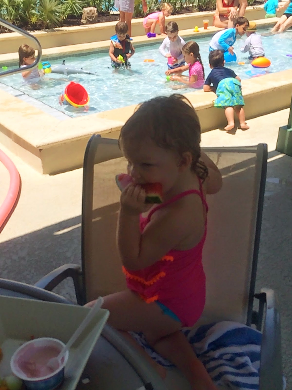 This is me eating fruit at the little pool. I like to swim at the big pool, but Baby Deeds is salting my big pool game. Luckily, Gigi came to the rescue and took me to big pool where I belong. I am a big girl. I went to swim lessons to prepare me for this opportunity. I'm really good and brave at jumping off the edge to Gigi's arms. After Mama took Deeds home, Gigi even took my puddle jumper off so I could really jump. It my favorite.
